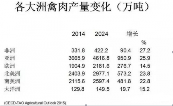 此外,據(jù)FAO(聯(lián)合國(guó)糧食及農(nóng)業(yè)組織)統(tǒng)計(jì),全世界雞肉產(chǎn)量保持平穩(wěn)增長(zhǎng),雞肉生產(chǎn)總量近一億噸。但各大洲區(qū)域發(fā)展不太平衡。2014-2040年期間,雖然非洲地區(qū)雞肉生產(chǎn)基數(shù)低,但增長(zhǎng)最快,增速為27%。因此在非洲,肉雞生產(chǎn)潛力巨大。