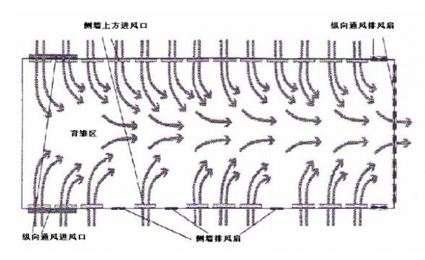 這種相對(duì)較新的通風(fēng)方法就是所謂的“過渡期通風(fēng)”,如下圖,其優(yōu)點(diǎn)是能在溫度上下波動(dòng)比較大或內(nèi)部環(huán)境變化較大的情況下進(jìn)行良好的通風(fēng)。進(jìn)行這樣的通風(fēng)時(shí),我們可以關(guān)閉雞舍前端為縱向通風(fēng)而設(shè)計(jì)的進(jìn)風(fēng)口,開啟一半或較少的風(fēng)機(jī)讓新鮮空氣從雞舍側(cè)墻上方的進(jìn)風(fēng)口進(jìn)入。這樣做的好處是既能進(jìn)行有效的通風(fēng)又能改善雞舍內(nèi)空氣均勻混合,而且避免雞群受到冷應(yīng)激。