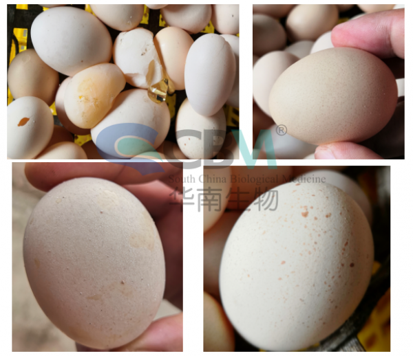 患雞吐口水,拉飼料便,逐漸消瘦;產蛋率下降,種蛋受精率下降,孵化后期(18天齡)死胚增多,孵出弱雛增多,死亡增多;種蛋大小不一,蛋殼質量變差,破殼蛋、軟殼蛋增多,血斑蛋、霉斑蛋增多。