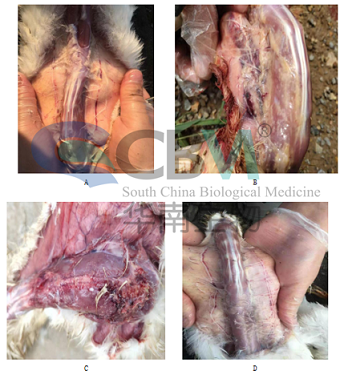 結果表明,A組吸收無異常;B組注射部位有較多未吸收疫苗;C組注射部位出現肉芽腫,炎性反應,干酪樣物;D組無異常。