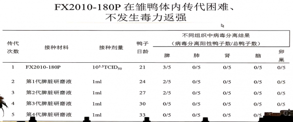 疫苗毒通過傳代致弱,無致病性。免疫后同居鴨群未受感染,且無法在體內傳代。說明其無水平傳播能力,無毒力返強風險。