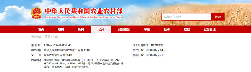 根據《獸藥管理條例》和《獸藥注冊辦法》規定,我部組織制定了重組禽流感病毒(H5+H7)三價滅活疫苗(H5N2 rSD57株+rFJ56株,H7N9 rLN79株)等4種獸藥產品制造及檢驗試行規程、質量標準、說明書和內包裝標簽,現予發布,自發布之日起執行。