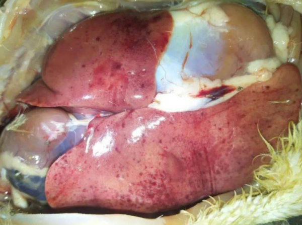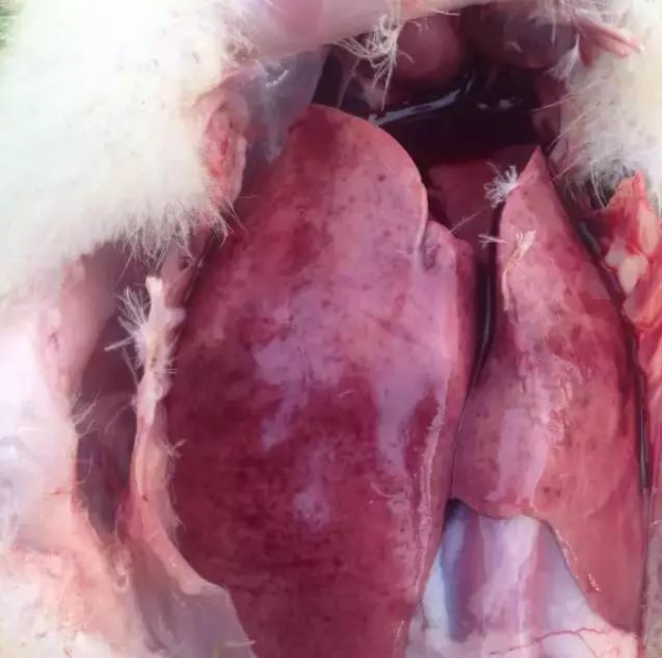 鴨肝炎病毒潛伏期一般為1~4d,突然發(fā)病,病程短促。病初表現(xiàn)為精神萎靡,眼半閉呈昏睡狀,羽毛松亂,翅下垂,行動呆滯,縮頸呆立,食欲不振甚至厭食、絕食;發(fā)病12~24h即出現(xiàn)神經(jīng)癥狀,病鴨全身性抽搐、運(yùn)動失調(diào)、兩腳痙攣,身體倒向一側(cè)或就地旋轉(zhuǎn),頭向后仰呈角弓反張狀,故俗稱“背脖病”。少數(shù)病鴨死亡前排黃白色和綠色稀糞,數(shù)小時(shí)后死亡。也有的雛鴨無明顯臨床癥狀便突然死亡。 剖析可見肝臟特征性病變:肝臟腫大,質(zhì)地柔軟,呈淡紅色或花斑狀,表面有出血點(diǎn)和出血斑,膽囊擴(kuò)張,充滿膽汁。脾臟有時(shí)腫大,也呈斑駁狀。腎臟充血、腫脹,呈暗紫色樹枝狀。
